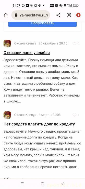 а так очень многие делают в интернете, сначала просят оплатить их кредиты и займы, потом до них доходит, что никто им на это ни копейки не даст и начинают просить на лечение ребёночка/бабушки/кошечки/собачки или ещё какие-то благие цели, знаем, сто раз проходилиoksana.sharova: 26 окт 2023, 22:15 ГОсподи да при чем кредиты, собаку прошу отвезти, собаку. Не нужно денег в данный момент.