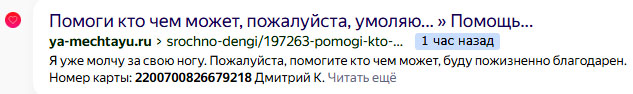 Это беспредел, ящетаю. Вы уже написали жалобу на медицинские учреждения за вымогательство и непредоставление услуг? Понёс ли работодатель наказание за незаконное увольнение? Доколе, граждане, мы будем это терпеть??!! Держите в курсе, автор, очень хочется посмотреть на торжество справедливости.ДмитрийКононов: 09 ноя 2023, 00:12 Оказался в трудной ситуации. На работе получил травму, разорвал связки на коленом сустава. Передвигаюсьс большим трудом, с помощью костылях. Из-за этого потерял работу. Операция сказали стоит около 30т.р. В данный момент нереальная сумма для меня. Со мной живет мама, досматриваю за ней, и семилетний сын. У мамы онкология, последней стадии, очень мучается. А я ничем помочь не могу. Маминой пенсии хватает только на коммуналку, на лечение и лекарства денег не остается. Даже на продукты не хватает. Я уже молчу за свою ногу. Пожалуйста, помогите кто чем может, буду пожизненно благодарен. Номер карты: 2200700826679218 Дмитрий К.