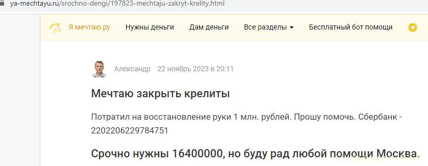 а почему вас там зовут Александром? там пишете, что лям потратили на лечение руки, здесь пишете, что только палату оплатить смогли до 30 ноября? уж не мошенник ли вы, часом?))MaryshevAA: 22 ноя 2023, 22:23 Сумма указана не правильно - 1,6 млн. Это общая сумма долгов. Пишу как есть. Но деньги нужны прежде всего на лечение руки