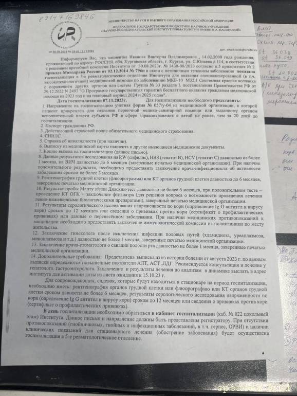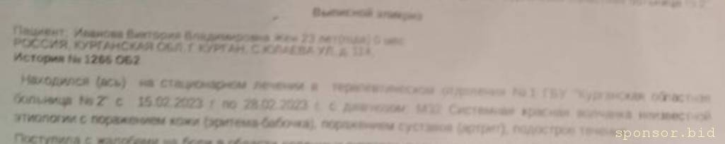 ну и что вы брешете про август, если в приложенных вами же документах указано, что вы с диагнозом "системная красная волчанка" находились в больнице с 15.02.2023 по 28.02.2023?Виктория553590: 05 янв 2024, 22:29 В августе 2023 года, к моему сожалению, во мне проявилась болезнь под названием "Системная Красная волчанка". По началу, все было не так уж и плохо, я работала, жила спокойна, но со временем начались жуткие боли, до постановления диагноза меня лечили не оттого что нужно, соответственно,