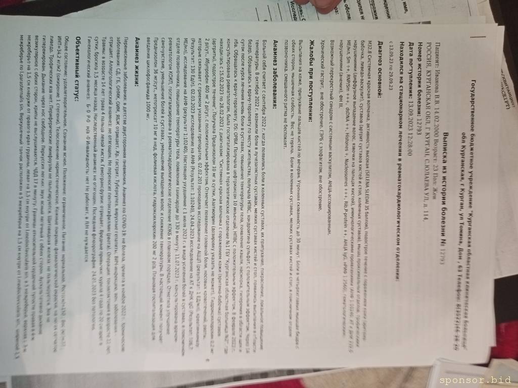 Всем здравствуйте, меня зовут Виктория, мне 23 года. В августе 2023 года, к моему сожалению, во мне проявилась болезнь под названием "Системная Красная волчанка". По началу, все было не так уж и плохо, я работала, жила спокойна, но со временем начались жуткие боли, до постановления диагноза меня лечили не оттого что нужно, соответственно, ничего не помогало, когда стало хуже мне пришлось взять больничный, но он сильно затянулся и меня уволили, потом все токи диагноз поставили , пока были накопления хватало и на сдачу анализов, и на продукты, К/у и прочее. Но когда накопления закончились, а меня направили в Москву на лечение в Институт ревматологии имени В А Насоновой , средств ехать до Москвы не было, пришлось брать кредит на дорогу туда и обратно, и на анализы и тд.