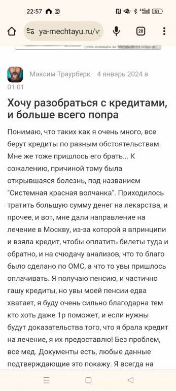 А сколько у вас кредит и сколько стоило лечение плюс билет?Виктория553590: 05 янв 2024, 22:29 Всем здравствуйте, меня зовут Виктория, мне 23 года. В августе 2023 года, к моему сожалению, во мне проявилась болезнь под названием "Системная Красная волчанка". По началу, все было не так уж и плохо, я работала, жила спокойна, но со временем начались жуткие боли, до постановления диагноза меня лечили не оттого что нужно, соответственно, ничего не помогало, когда стало хуже мне пришлось взять больничный, но он сильно затянулся и меня уволили, потом все токи диагноз поставили , пока были накопления хватало и на сдачу анализов, и на продукты, К/у и прочее. Но когда накопления закончились, а меня направили в Москву на лечение в Институт ревматологии имени В А Насоновой , средств ехать до Москвы не было, пришлось брать кредит на дорогу туда и обратно, и на анализы и тд.