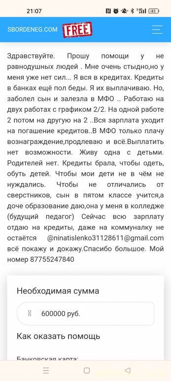 а сколько надо-то?Niкаia: 13 янв 2024, 21:04 Здравствуйте.Помогите пожалуйста.Нужна финансовая помощь.У меня две работы, работаю без выходных,но всё равно не могу справиться.До конца месяца заберут квартиру,она в залоге, кредиты душат, чтобы закрыть один, брала другой и так замкнутый круг,дошло до того,что останусь без жилья. С детьми. Пожалуйста,умоляю,если есть люди которые могут помочь, можете написать ninatislenko31128611@gmail.com я все документы покажу , всё расскажу.Мне стыдно просить, очень.Но у меня действительно безвыходная ситуация.KZ23722C000049215991,