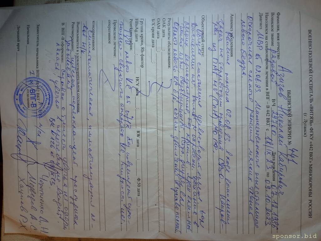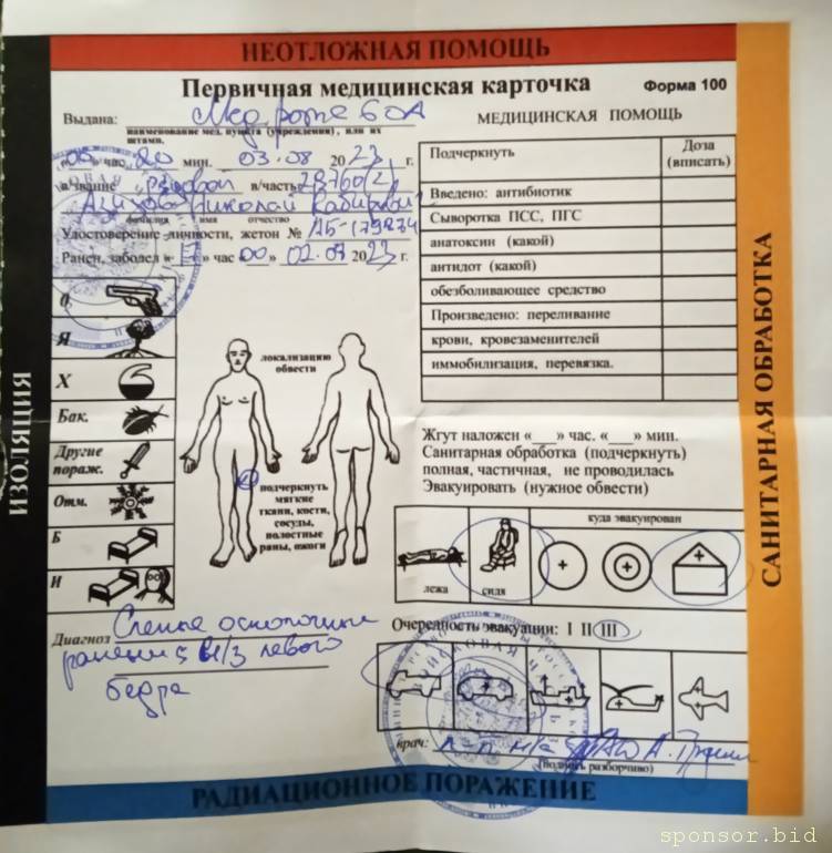 Знаете что там полный бардак тварится в госпиталях, справку о степени тяжести ранения не дали да, указ 98 я успел только сфотографировать оригинал забрали, в большинсьво случиях осколки там в госпиталях достают без какого либо обезболивающего на живую, за эти два месяца я 5 госпиталей проехал. Валуйки Белгород Чернянки Марковка и конечный Луганск, думаете если все так просто было бы я обращался на какие то сайты форумы просил бы финансовую поддержку? Вы обратите внимание когда сделан рентген на дату, делал я его уже дома в Бурятии, потому что понять не мог почему у меня постоянно нога болит, вот так в госпиталях и лечат что оставляют осколки. Я не кого не принуждаю, если есть не равнодушные люди помогут, нет так нет, есть мой номер для связи, если здесь что то не понятно объяснил могу по телефону объяснить