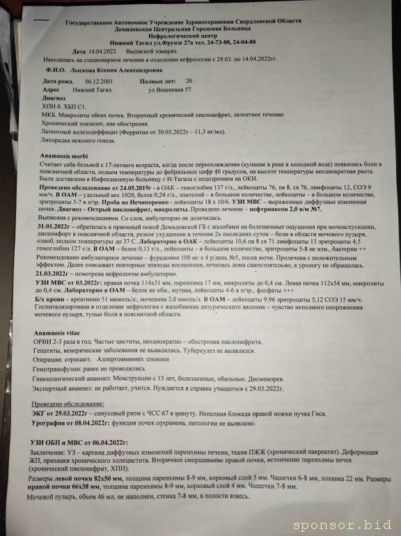 У меня больные почки, часто мучают приступы (вернее будет сказать - обострения) и вот сейчас снова началось обострение, не хватает средств на лекарства, нужно 5 тысяч рублей, не более. Все доказательства могу представить. Мне очень больно на данный момент, не могу ходить, лежать, сидеть, в туалет тоже не могу сходить, я не могу больше это терпеть, помогите пожалуйста