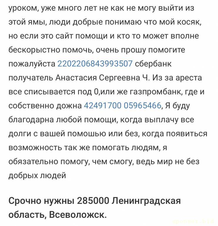 Хорошо бы поставить в известность органы опеки о том, что вы не только не в состоянии обеспечить своего ребёнка, но и проедаете его пособия и тратите их на аренду.Крошка Настя: 23 апр 2024, 16:20 Я не живу у родственников в деревне, я еще в декретном отпуске уехала, точнее пришлось, живу в другом городе и снимаю квартиру, а на счет того обьявления, я хотела отредактировать, не со сбера под 0 списывают, но мне наптсали ждать 6000 секунд, а о квартире я действительно мечтаю, даже в моем родном городе, однушки стоят от 4 млн и это причем все вторички, новые дома там не строятся, это на севере, я сама сейчас живу во всеволожске, по сути живу на пособия ребенка, из них и оплачиваю квартиру сьемную, на еду хватает, а о квартире мечтать никто не запрещает
