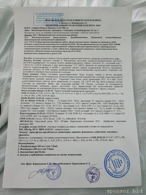 В вашем документе сложно разобраться. Сочувствую, но вы можете лечиться по ОМС.Кирилл Leicoz: 13 май 2024, 13:39Острый промиелоцитарный лейкоз, в документе написано же!VictorBorisovich: 13 май 2024, 11:48 Какой лейкоз, если в документе анемия написана?