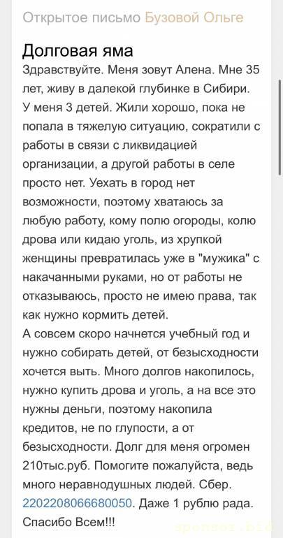 Вы не всё рассказали и не с самого начала. Где ваш супруг, который обязан этих детей содержать?AlenaMama3: 18 июл 2024, 04:40 Здравствуйте Всем. Никогда не просила о помощи, но выхода нет. Расскажу все с самого начала. Живу в Сибире, Новосибирская область, в селе, у меня трое деток, первый сын ходит в 7 класс, второй сынок идёт в первый класс и дочка 3 года ходит в сад. Но так случилось что с работы уволили в связи с ликвидацией организации. В селе работы нет от слова совсем, в город переехать возможности нет, поэтому хватаюсь за любую работу, кому полю огород, кому то Колю дрова или перекидываю уголь, из молодой 35 ней женщины стала похожа на мужика с накачанными руками, но отказаться от работы просто не имею права, надо поднимать детей. А скоро школа , я не знаю как мне быть как собрать детей , одеть обуть и купить школьные принадлежности, денег просто нет. Буду рада любой финансовой помощи, даже рублю. Спасибо всем за внимание и понимание!!! Мой номер карты сбера 2202208066680050