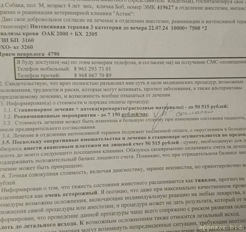 А какие это суммы, что двое работающих взрослых не справляются?Raccoon656: 22 июл 2024, 23:15 Здравствуйте!Мы с женой и одним из наших питомцев,попали в очень плохую ситуацию.Мы шли через частный сектор,на приём (с приема) к (от) ветеринарному(го)врачу(а) Почему так-неизвестно в какой момент случилось это роковое событие.Наш пёсик,как и остальные,любит щипать на улице травку.Судя по отчётам ветеринарного врача из клиники,в которой сейчас пёсик борется за жизнь, вместе с травой в организм попал пропиленгликоль(используется в тормозной жидкости автомобиля,омывайке, шампунях для авто). Пёсик находится на лечении в клинике и каждый день его содержания там-не мало стоит.Мы с женой заняли уже у всех, кого только можно.Этот сайт я нашел через поиск и решил попросить помощи тут у неравнодушных Пёс был подобран с улицы,как и собачка которая жила у нас до этого,как и второй пёсик и кошечка.Мы с женой оба работаем,но не вытягиваем суммы, которые выставляется клиникой.Очень прошу Вас помочь Члену нашей семьи.